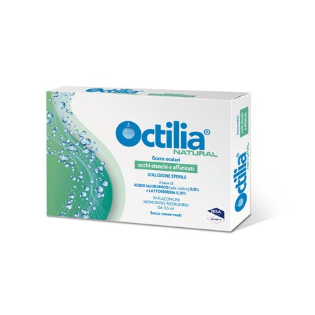 Octilia Natural Occhi stanchi e affaticati è studiato per mantenere la corretta composizione del film lacrimale e contiene lo 0,15% di acido ialuronico (sale sodico) e lo 0,20% di lattoferrina, che agiscono sinergicamente nella formulazione.