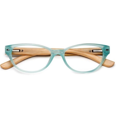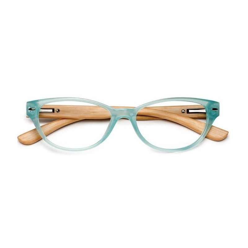 Occhiali da lettura per presbiopia con astine in legno e montatura colorata. Forniti di accessori.