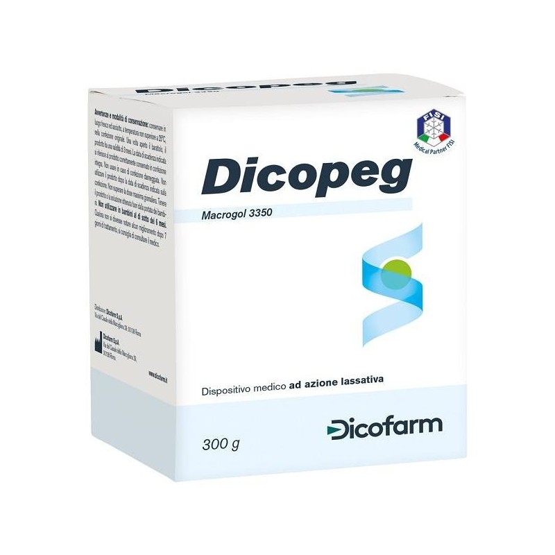 Dispositivo medico ad azione lassativa che, attraverso un’azione di tipo osmotico, regolarizza l’intestino in modo naturale. Non viene assorbito né fermenta nell’intestino, non irrita la mucosa e viene eliminato nelle feci in forma non modificata. Dicopeg è particolarmente indicato nella stitichezza cronica e nei casi di intestino occasionalmente irregolare. Grazie infatti alla sua affinità per l’acqua, Dicopeg ammorbidisce le feci facilitando l’evacuazione. La sua efficacia non si riduce nel tempo.