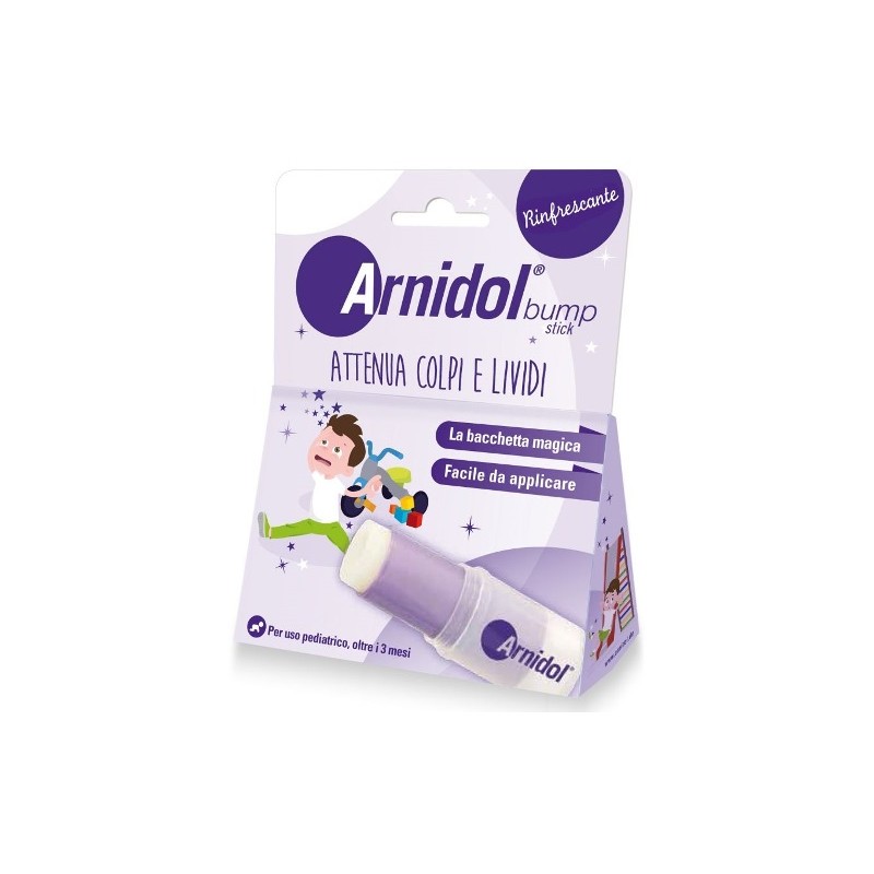 Arnidol Bump stick è un gel solido che, grazie al suo massaggio e all’effetto rinfrescante, allevia il dolore ed evita la comparsa dei lividi dopo una contusione o un colpo. La confezione in stick ne permette una facile applicazione e consente di averlo sempre a portata di mano. Per uso pediatrico, oltre i 3 mesi.