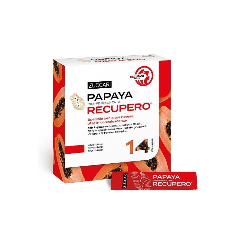Papaya Recupero è ideale nei periodi di debolezza, spossatezza e quindi utile anche nei periodi di convalescenza. La papaya bio-fermentata zuccari è resa speciale da Recufast Complex, un mix di attivi per un pronto e pieno recupero: eleuterococco tonico-adattogeno, cordyceps sinensis per l'azione tonica e di sostegno metabolico, ferro e vitamine del gruppo B per ridurre stanchezza e affaticamento oltre a vitamina C che contribuisce al normale metabolismo energetico e accresce l'assorbimento del ferro. L'esclusivo mix è reso completo da pappa reale, reishi e carnitina.