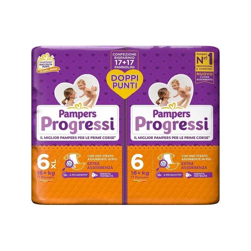 Pampers Progressi Pannolino Extralarge 15-25 kg Pacco Doppio 34 pezzi è il pannolino tradizionale con chiusura a strappo progettato per bambini più grandi. Offre protezione elevata, comfort e sicurezza anti-perdita fino a 12 ore.