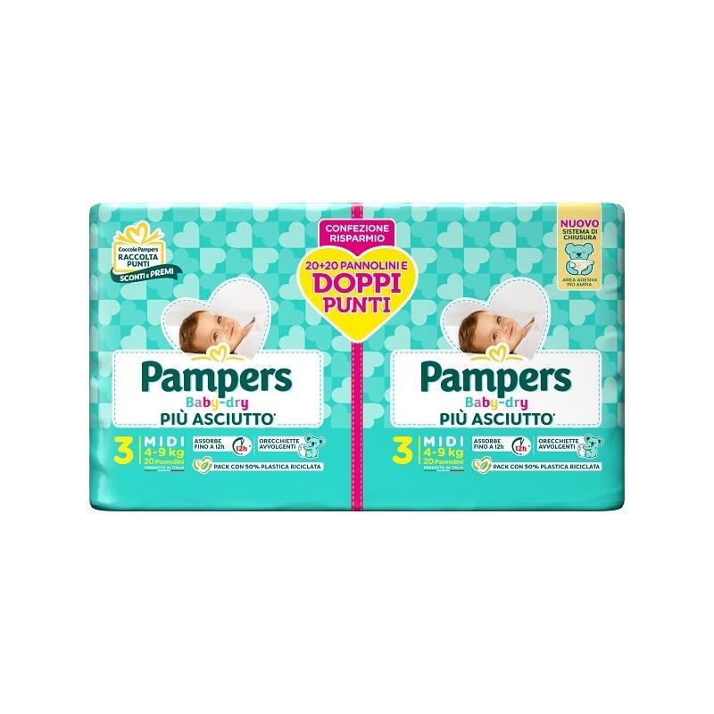 Pampers Baby Dry Pannolino Midi 6-10 kg Duo Downcount 40 pezzi è il pannolino tradizionale con chiusure adesive studiato per offrire protezione prolungata, comfort e sicurezza anti-perdita nei bambini in crescita.
