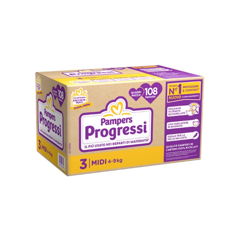Pampers Progressi Midi 108 Pezzi è un pannolino indicato per neonati tra 4 e 9 kg, progettato per offrire elevata delicatezza e assorbenza nei primi mesi di vita.
