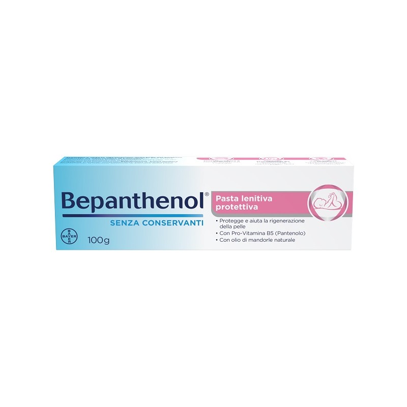 Bepanthenol pasta lenitiva protettiva adatta al neonato, serve in caso di arrossamenti del sederino, forma uno strato protettivo trasparente che lascia respirare la pelle. Contiene Pantenolo 5%, che favorisce il naturale processo di rigenerazione della pelle. Prodotto da Bayer.