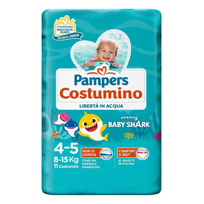 Pampers Costumino Baby Shark Taglia 4-5 (9-16 kg) 11 pezzi è il pannolino specifico per piscina e mare progettato per offrire protezione in acqua senza gonfiarsi, garantendo comfort e libertà di movimento.