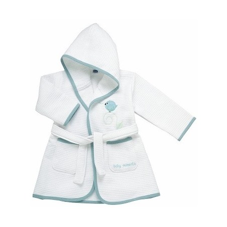 Accappatoio in pregiato tessuto piquet con cappuccio, due tasche e una pratica cintura di chiusura.