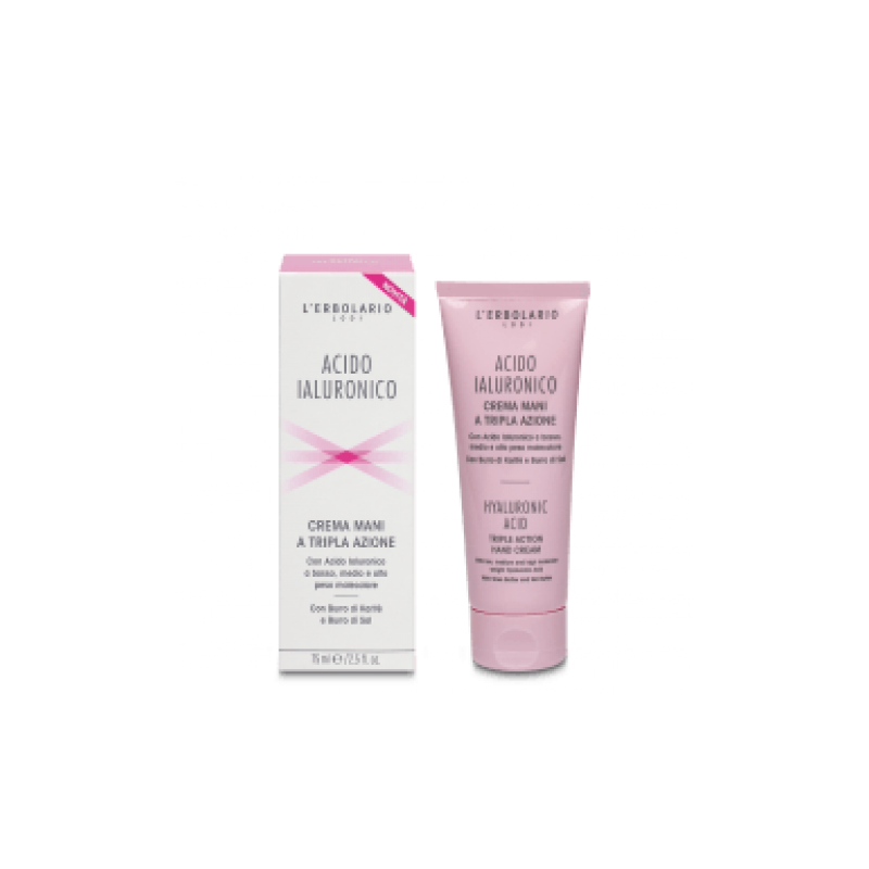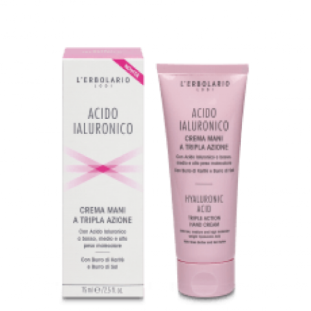 L'erbolario Lodi Acido Ialuronico Crema Mani a Tripla Azione, con Acido Ialuronicoa basso, medio e alto peso molecolare. con burro di Karitè e Burro di Sal, è una crema mani per un trattamento restitutivo e idratante per le mani. Prodotto da L'erbolario.