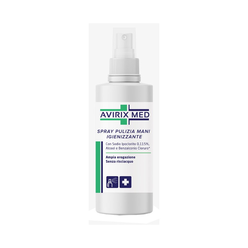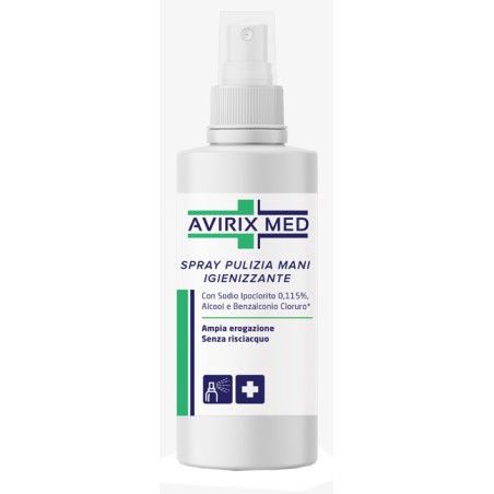 Avirix Med è uno spray cosmetico per le mani che pulisce, igienizza e aiuta a preservare lo stato di pulizia delle mani ove non è possibile lavarle mediante le convenzionali prassi di detersione. Con sodio ipoclorito 0,115%, alcool e benzalconio cloruro (preservante). Ampia erogazione. Senza risciacquo.