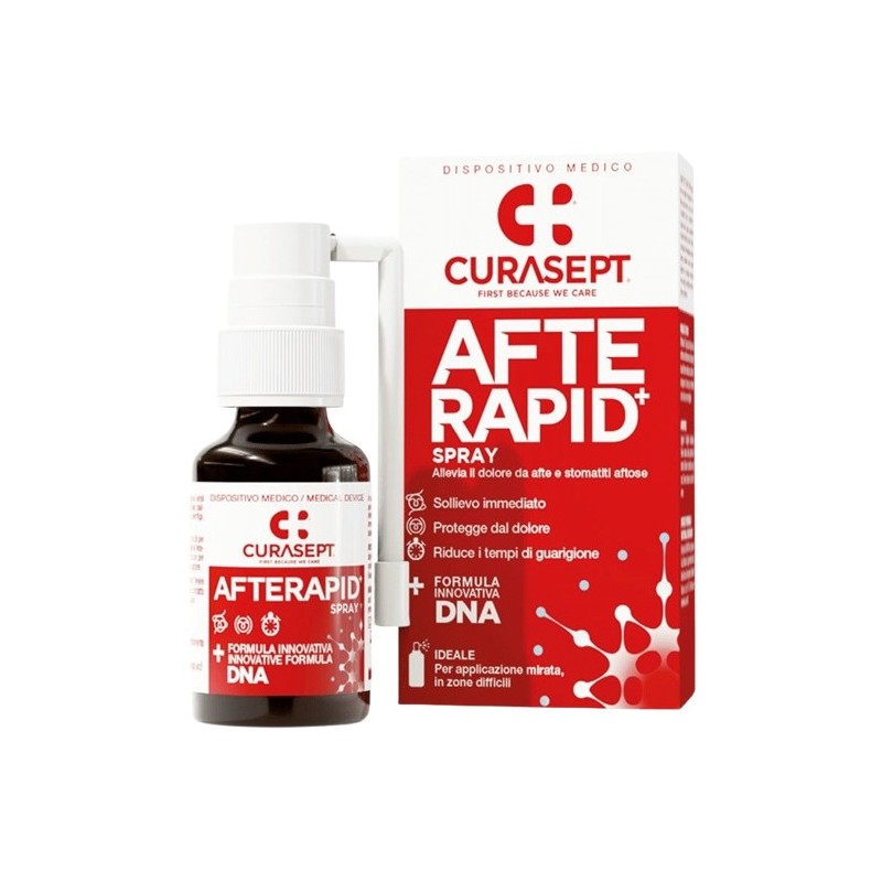 Curasept Afte Rapid Spray allevia il dolore sda afte e stomatiti aftose.
