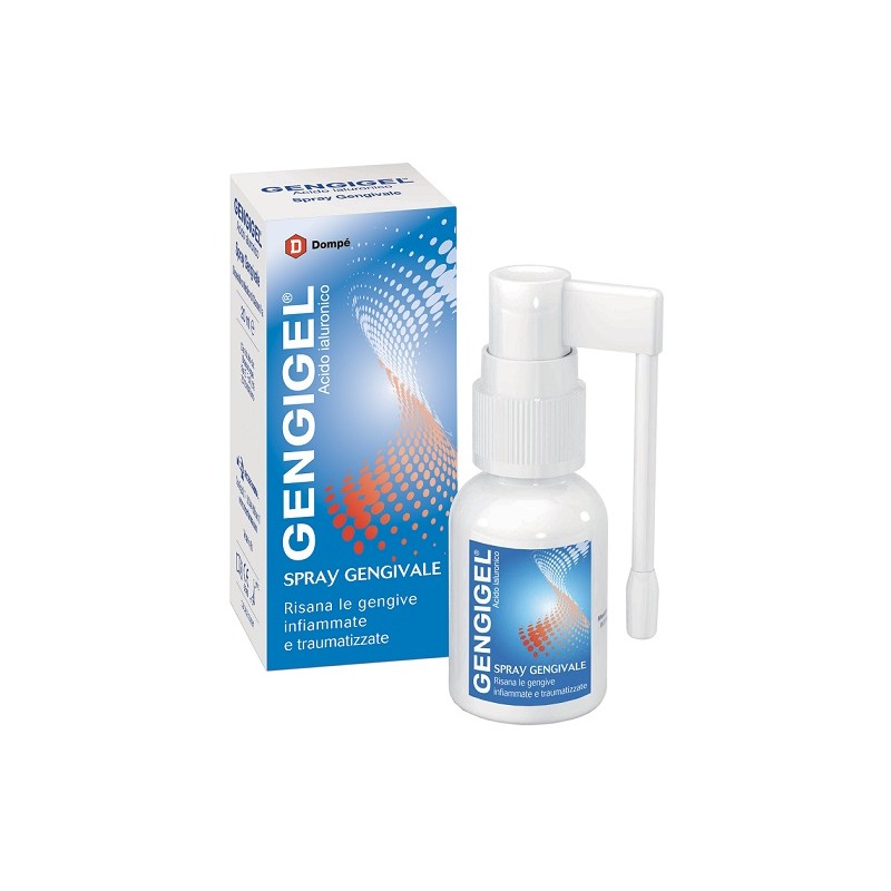 Gengigel Spray Gengivale è un dispositivo medico a base di acido ialuronico ad alto peso molecolare (HMW) (in forma di sodio ialuronato), ottenuto con processi biotecnologici che ne garantiscono l’elevata purezza. La sua formulazione è specificamente studiata allo scopo di adattarsi alla mucosa gengivale normale. Prodotto da Dompe' Farmaceutici.