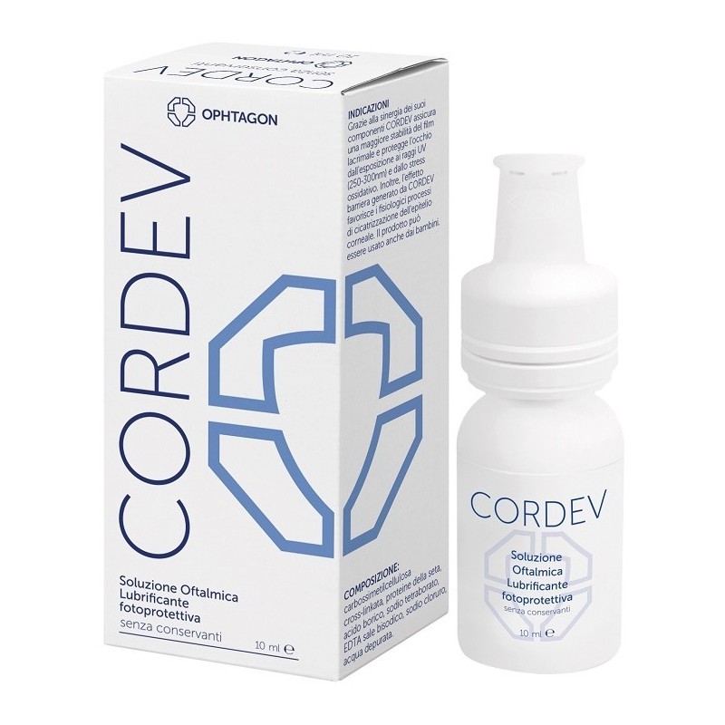 Grazie alla sinergia dei suoi componenti, CORDEV assicura una maggiore stabilità del film lacrimale e protegge l'occhio dall'esposizione ai raggi UV (250-300 nm) e dallo stress ossidativo. Inoltre, l'effetto barriera generato da CORDEV favorisce i fisiologici processi di cicatrizzazione dell'epitelio corneale.