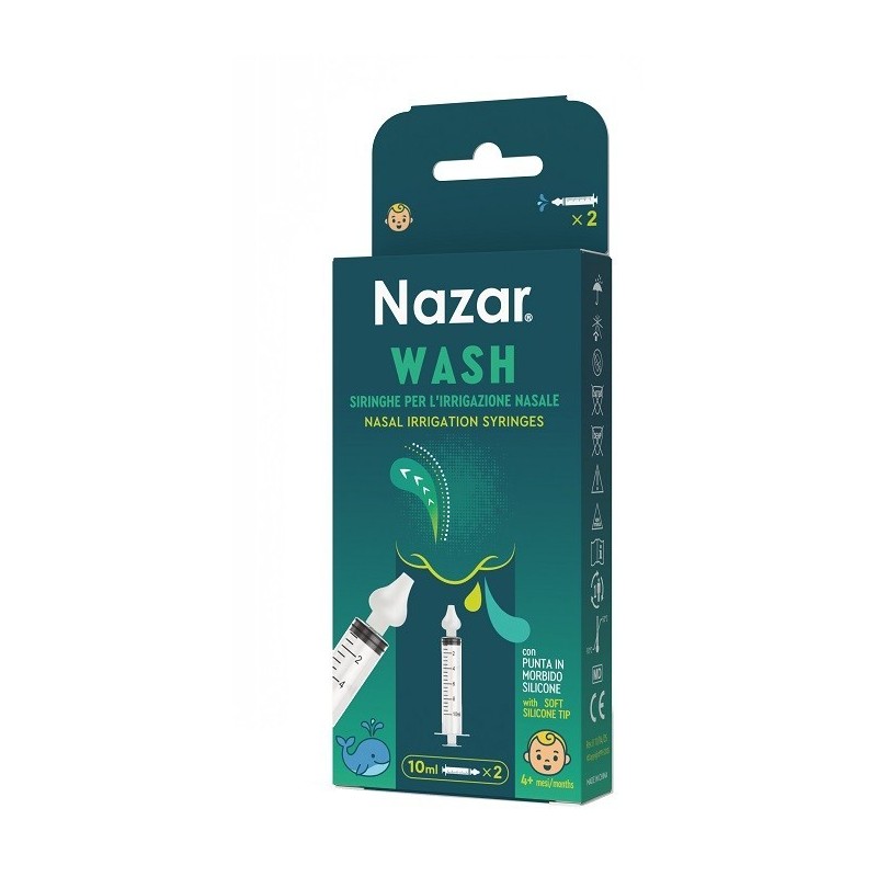 La soluzione fisiologica deve essere a temperatura ambiente. Non utilizzare soluzioni con temperature superiori a 40°C. Non utiliuare Nazar Wash quando una narice è completamente ostruita, in presenza di sanguinamento nasale, in presenza di un'infezione all'orecchio e nei bambini di età inferiore ai 4 mesi. Utilizzare con cautela nei pazienti con malattie mentali o gravi disabilità intellettive. Non utilizzare Nazar Wash in pazienti con danni o anomalie alle cavità nasali o ai seni paranasali. Si raccomanda di non condividere il dispositivo di lavaggio con più persone per evitare infezioni crociate. Utilizzare secondo indicazione del medico/pediatra. Non eseguire l'irrigazione nasale prima di andare a letto o di uscire, poiché la soluzione residua potrebbe fuoriuscire dalla narice 20 minuti dopo l'irrigazione. Tenere fuori dalla portata dei bambini. Nazar Wash contiene piccole parti che potrebbero essere ingerite. Questo prodotto deve essere assemblato e maneggiato esclusivamente da un adulto. Smaltire secondo le normative local i vigenti. Segnalare qualsiasi incidente grave verificatosi in relazione al dispositivo al fabbricante e all'autorità competente dello stato membro di riferimento.