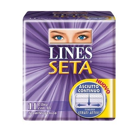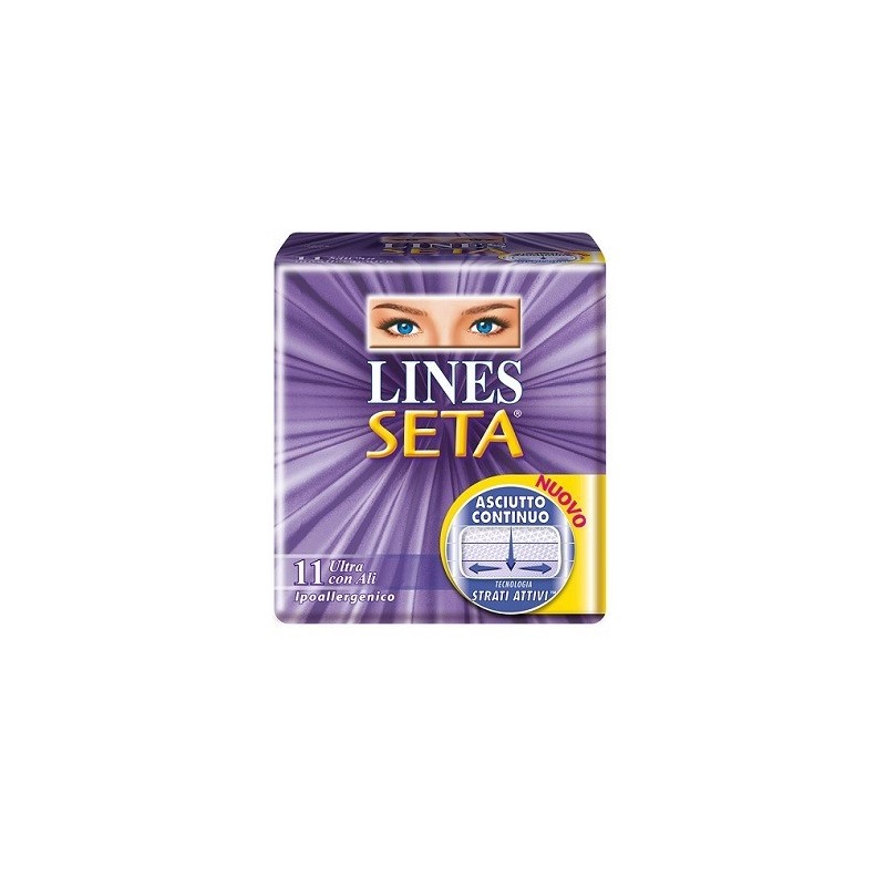 Lines seta serve da assorbente igienico femminile durante i giorni del ciclo è un prodotto con tecnologia "Strati Attivi": il liquido filtra velocemente verso il basso, dal primo all'ultimo strato ad assorbenza potenziata, dove rimane bloccato lontano dalla pelle.