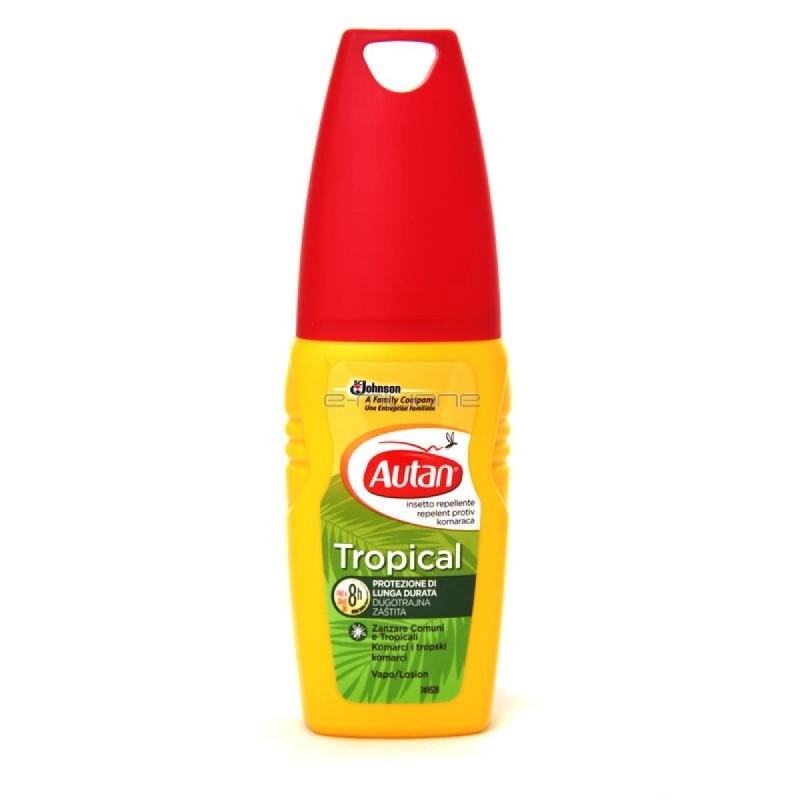 Autan Tropical spray è uno spray prodotto da Sc Johnson Italy ad azione insetto-repellente indicato per offrire una protezione ottimale e di lunga durata particolarmente indicato per chi viaggia nei paesi tropicali utile nella sua azione contro zanzare comuni e tropicali fino a 8 ore e zanzare tigre fino a 4 ore. Aiuta a tenere lontane le zanzare che possono trasmettere malattie tropicali quali: malaria, febbre del Dengue, febbre gialla e chikungunya. Indicato nel caso in cui ci si trovi in ambienti aperti ad elevato rischio di punture come per la spiaggia o il campeggio. La sua formulazione dermatologicamente testata rende il prodotto ben tollerato e quindi adatto a tutta la famiglia.