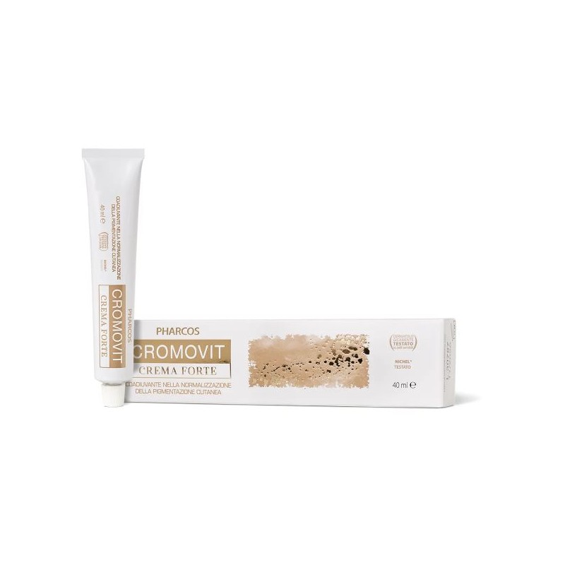 Cromovit Crema forte è un prodotto cosmetico contenente un pool di sostanze (Acido folico in forma liposomiale, Fenilalanina, Beta-sitosterolo, Resveratrolo, Decarbossi-carnosina HCL, Estratto di Boldo) indicate per riequilibrare alcuni processi presenti nella depigmentazione della cute. L'acido ialuronico a elevato peso molecolare, in qualità di sistema veicolante e cito-attivante cutaneo, ne migliora l'efficacia. La formulazione è arricchita con Piperina da Pepe Nero che contribuisce ulteriormente all'azione riequilibrante la pigmentazione cutanea, rendendo il processo più rapido. Il prodotto è compatibile con elio e fototerapia. Senza profumo, nichel testato e dermatologicamente testato.