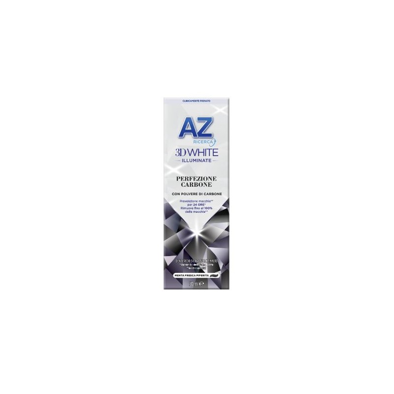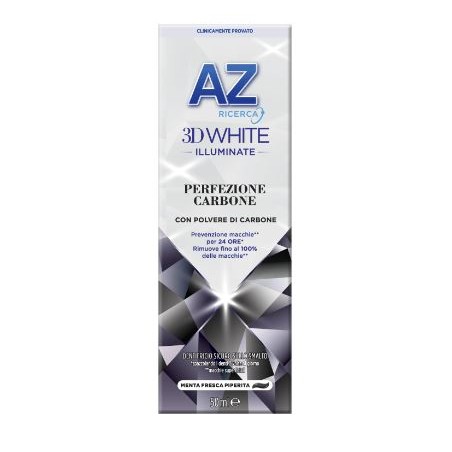 AZ 3D White Illuminante Carbone 50 ml è un dentifricio sbiancante formulato con carbone attivo, studiato per aiutare a rimuovere le macchie superficiali e donare maggiore luminosità al sorriso.