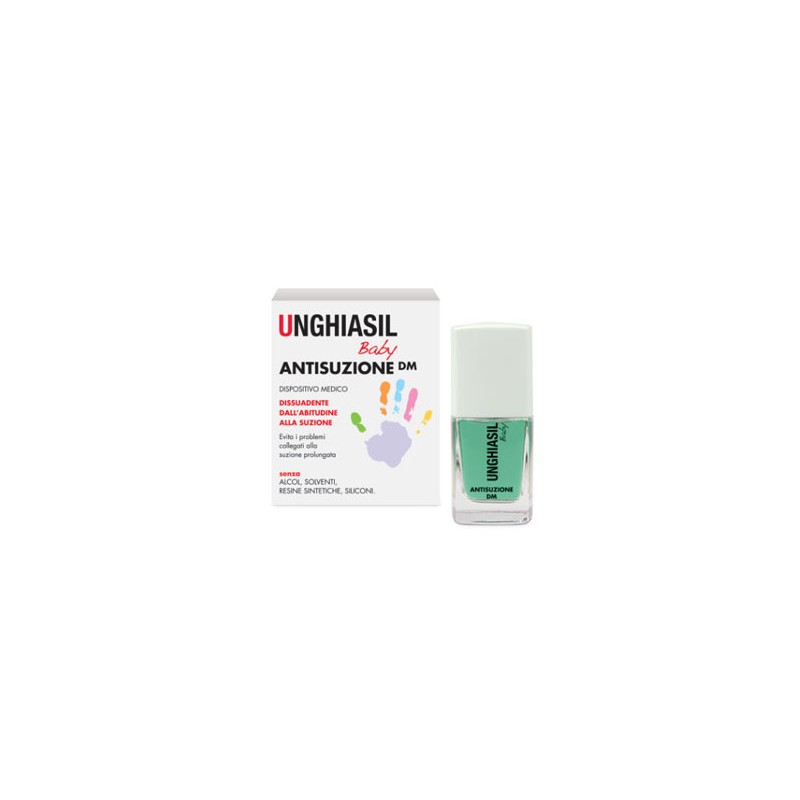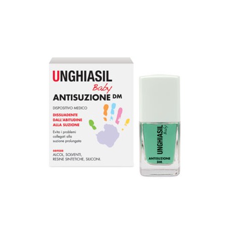 Unghiasil Baby Antisuzione DM è un dispositivo medico da utilizzare sulle mani e sugli oggetti che il bambino porta alla bocca.