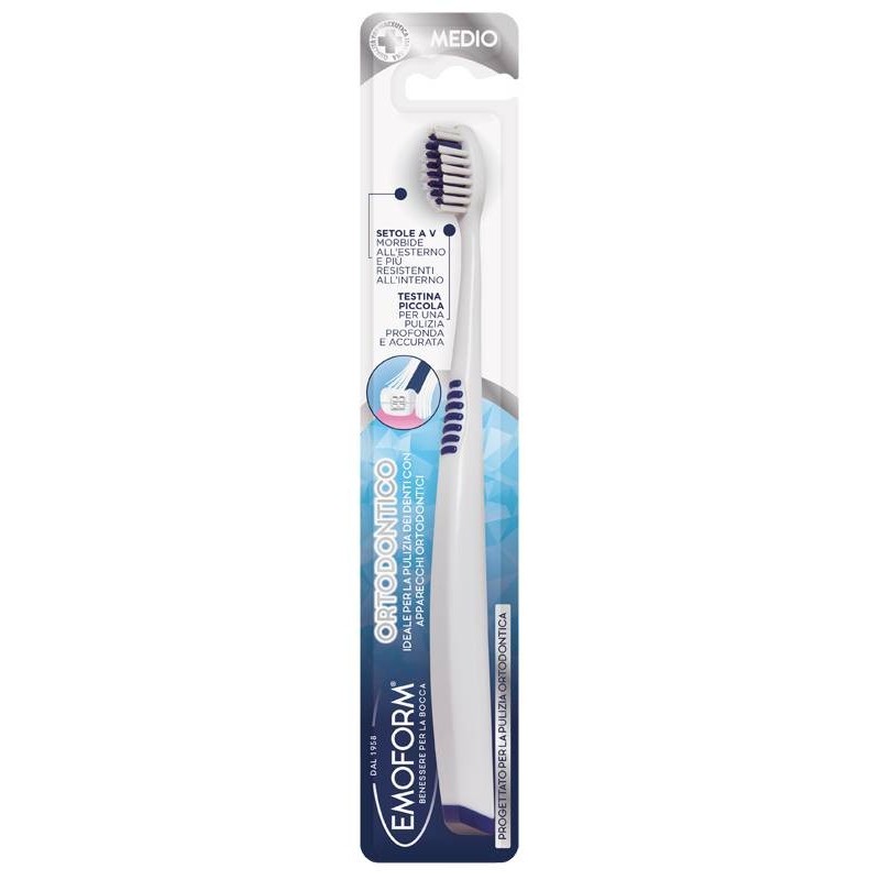 Spazzolino dedicato alla pulizia dei denti in presenza di apparecchi ortodontici. Taglio a V con setole esterne più morbide, efficaci e delicate sulle gengive e setole interne più dure per una corretta igiene dell'apparecchio.