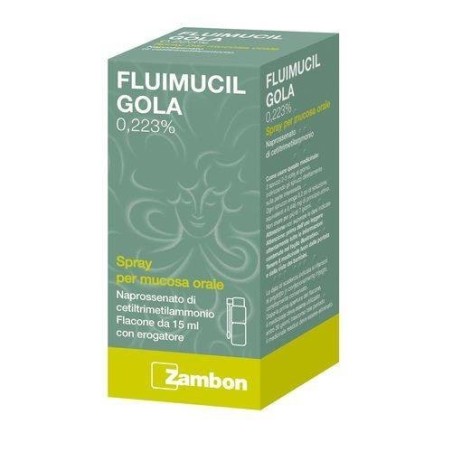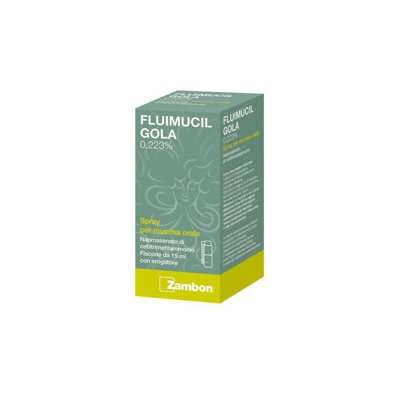 FLUIMUCIL GOLA 0,223% COLLUTORIO 100 ml di soluzione contengono Principio attivo: naproxenato di cetiltrimetilammonio 0,223 g. FLUIMUCIL GOLA 0,223% SPRAY PER MUCOSA ORALE 100 ml di soluzione contengono Principio attivo: naproxenato di cetiltrimetilammonio 0,223 g. Per l’elenco completo degli eccipienti vedere paragrafo 6.1.