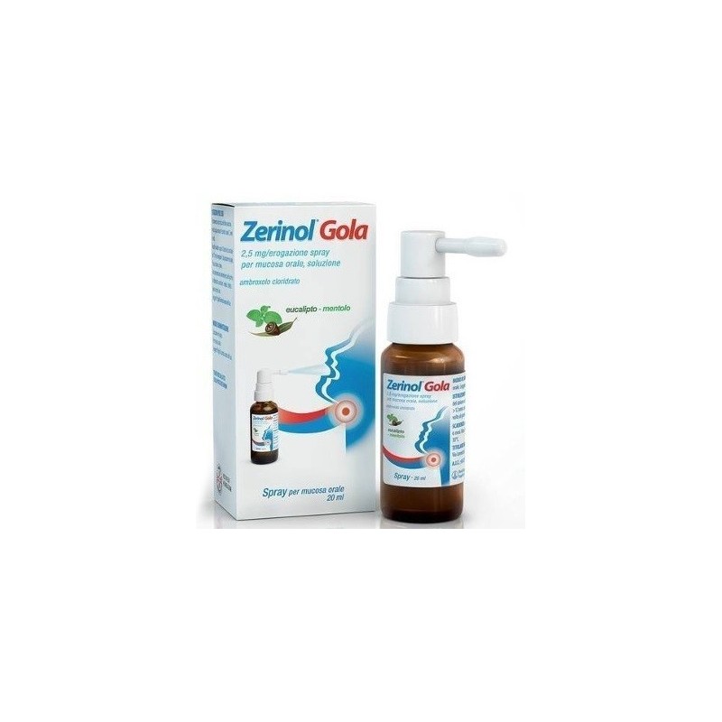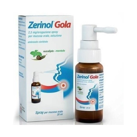 La soluzione spray per mucosa orale da 2,5 mg/erogazione di Zerinol Gola non può essere usata per più di 3 giorni. Se i sintomi peggiorano o persistono dopo 3 giorni o se il paziente ha la febbre alta, si deve consultare un medico. Sono stati segnalati casi di reazioni cutanee gravi quali eritema multiforme, sindrome di Stevens–Johnson (SJS)/necrolisi epidermica tossica (TEN) e pustolosi esantematica acuta generalizzata (AGEP) associati alla somministrazione di ambroxolo cloridrato. Se sono presenti sintomi o segni di rash cutaneo progressivo (talvolta associato a vesciche o lesioni della mucosa), il trattamento con ambroxolo cloridrato deve essere interrotto immediatamente e deve essere consultato un medico. Episodi di dispnea si possono verificare in un contesto di malattia latente come per esempio la gola gonfia. Anche reazioni allergiche locali (vedere paragrafo 4.8: angioedema) possono essere causa di dispnea. Le proprietà anestetiche locali di ambroxolo possono contribuire ad alterare la percezione sensoriale a livello dello spazio faringeo (vedere paragrafo 4.8: ipoestesia del cavo orale e della faringe). Zerinol Gola 2,5 mg/erogazione spray per mucosa orale, soluzione non è adatta per il trattamento delle ulcere del cavo orale. In questi casi rivolgersi al medico. In caso di funzionalità renale compromessa o di grave epatopatia, la soluzione spray per mucosa orale da 2,5 mg/erogazione di Zerinol Gola può essere usata solo dopo aver consultato il medico. Come per ogni medicinale con metabolismo epatico seguito da eliminazione renale, in caso di insufficienza renale grave, può verificarsi l’accumulo di metaboliti di ambroxolo nel fegato. Questo medicinale contiene piccole quantità di etanolo (alcool), inferiori a 100 mg per dose (4 erogazioni). Questo medicinale contiene propilenglicole, che può provocare irritazione cutanea e delle mucose. Popolazione pediatrica Zerinol Gola 2,5 mg/erogazione spray per mucosa orale, soluzione non deve essere usato in bambini di età inferiore a 12 anni.
