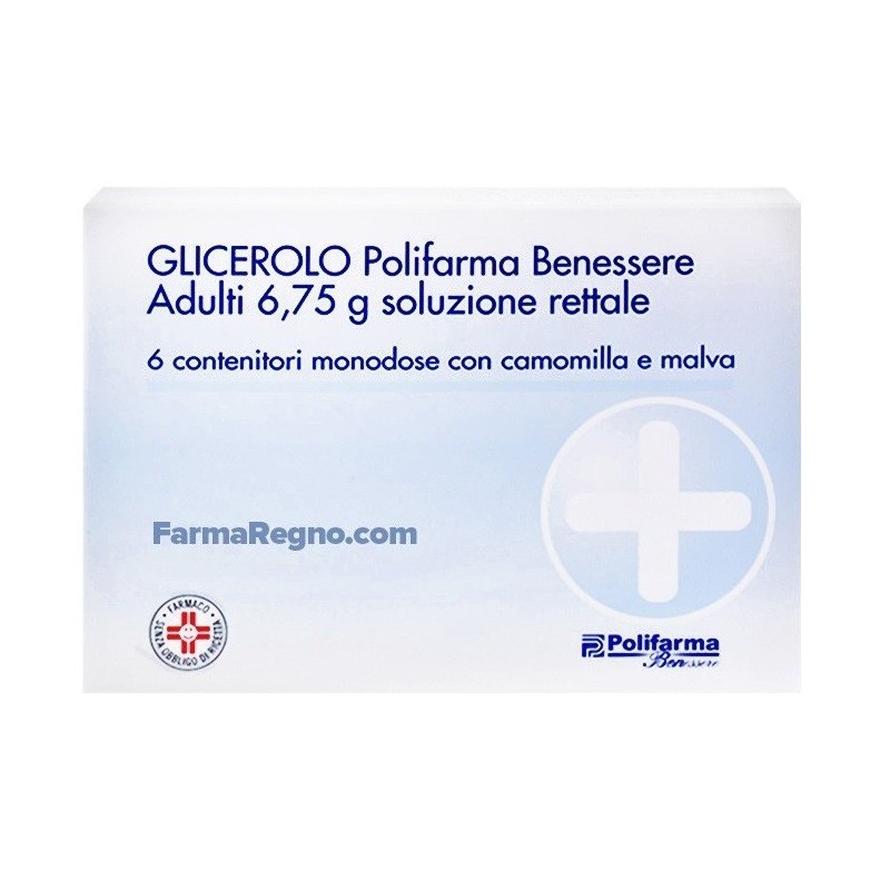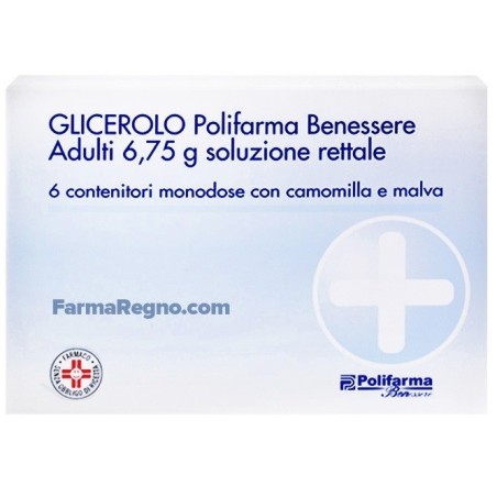GLICEROLO Polifarma Benessere “prima infanzia 2,25 g soluzione rettale” Ogni contenitore monodose contiene: principio attivo: Glicerolo 2,25 g. GLICEROLO Polifarma Benessere “adulti 6,75 g soluzione rettale” Ogni contenitore monodose contiene: principio attivo: Glicerolo 6,75 g. Per l’elenco completo degli eccipienti, vedere paragrafo 6.1.