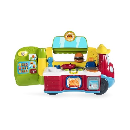 - cucina: piano cottura con suoni realistici di cottura e divertenti melodie, lavandino con rumore dell'acqua e divertente canzone e forno dove poter inserire la pentola e cucinare hamburger;