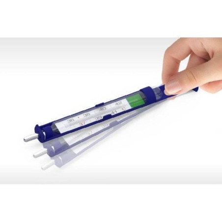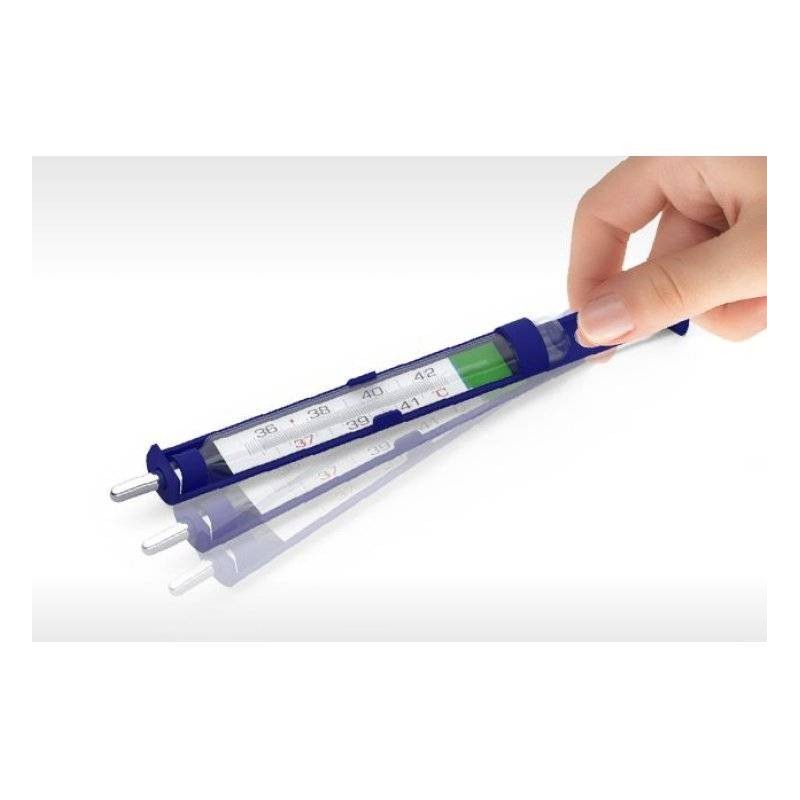 Termometro in vetro che non contiene mercurio. Al suo posto c'è una particolare lega di indio, gallio e stagno. Misura la temperatura corporea ascellare, orale o rettale. È un termometro tradizionale e semplice da utilizzare. Grazie al nuovo look moderno e funzionale e alla lente d'ingrandimento, aiuta a leggere senza sforzo la temperatura. In più è dotato di un particolare abbattitore ergonomico, così far scendere la colonnina dopo la misurazione è veloce e poco faticoso. È contenuto in un apposito astuccio rigido protettivo, per riporlo correttamente.