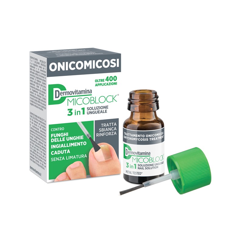 Dermovitamina MICOBLOCK SOLUZIONE UNGUEALE non è uno smalto. Se lo si desidera, è possibile applicare sul suo film protettivo uno smalto cosmetico (dopo almeno un’ora dall’applicazione).