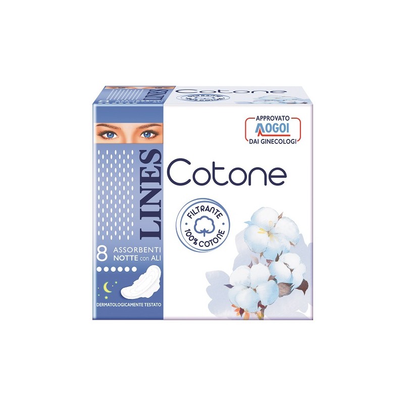 Lines Cotone Ultra Notte sono degli assorbenti ripiegati in bustina. Per flussi più intensi come quelli della notte. Prodotto da Fater.